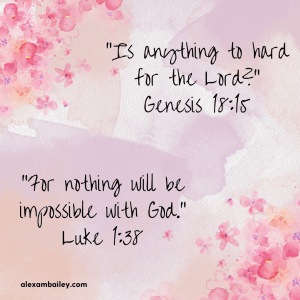 I pray the stories of these women remind you, when you are met with a seemingly impossible situation, you can ask yourself, “Is anything to hard for the Lord?” and remember the answer, “For nothing will be impossible with God” (Gen. 18:15; Luke 1:38).