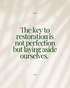 The key to restoration is not perfection but laying aside ourselves. Mitchell Chase says, “In union with him [Christ], sinners live now, though outwardly they are still wasting away.” What Jesus promises when we unite ourselves to him is inward restoration, even though outwardly our problems may still exist. And because of that inward restoration, and the sealing of the Holy Spirit that Ephesians 1 talks about, we can have peace even if we’re still in the midst of a tumultuous relationship or a mental health struggle, or a hard to forgive hurt.
